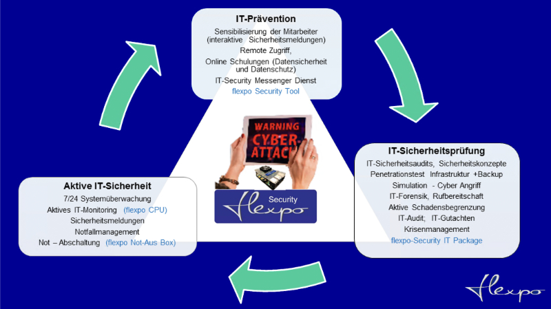 flexpo IT-Security konzentriert sich hauptsächlich auf genau diese Schadensreduktion und nicht auf das Unausweichliche. Einen Cyberangriff an sich. Denn dieser wird früher oder später stattfinden.